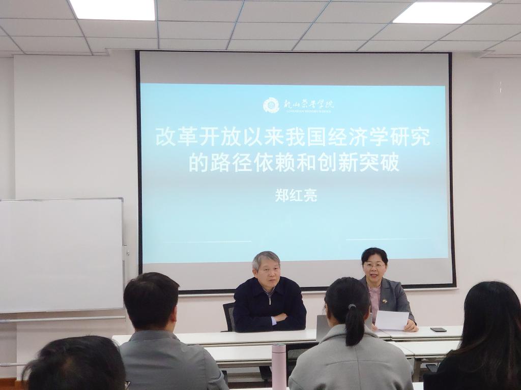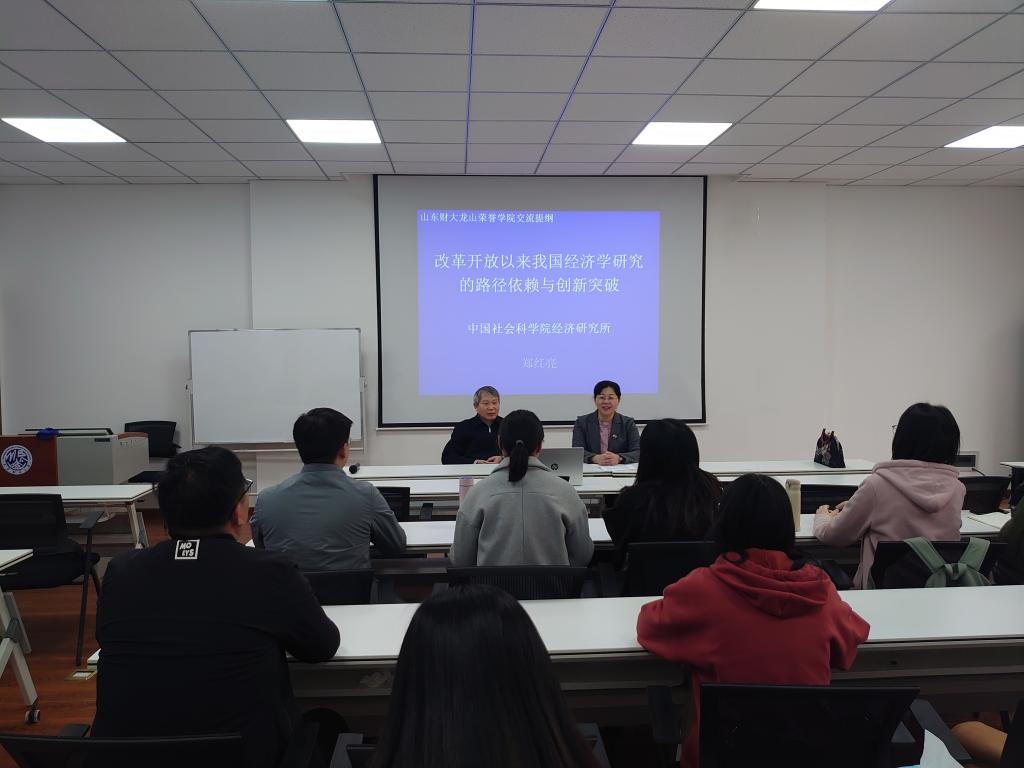 3月29日下午,龙山大讲坛第6期在燕山校区国际交流中心2楼MBA202教室举行,本期邀请中国社科院经济研究所博士生导师、《经济研究》副主编郑红亮教授作为主讲嘉宾,以“改革开放以来我国经济学研究的路径依赖和创新突破”为主题。讲座由龙山荣誉学院方慧教授主持,龙山荣誉学院研究生学术创新实验班及学校相关专业硕士、博士研究生参加。