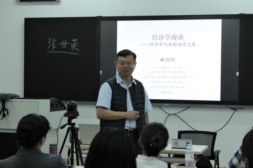 4月1日下午,龙山大讲坛第7期在圣井校区5304教室进行。本期龙山大讲坛由山东省消费与发展研究所和产业经济研究所所长、山东师范大学经济学院院长臧旭恒教授担任主讲嘉宾,以“经济学与我的治学之路”为主题,由方慧教授主持,龙山荣誉学院全体本科生参加。