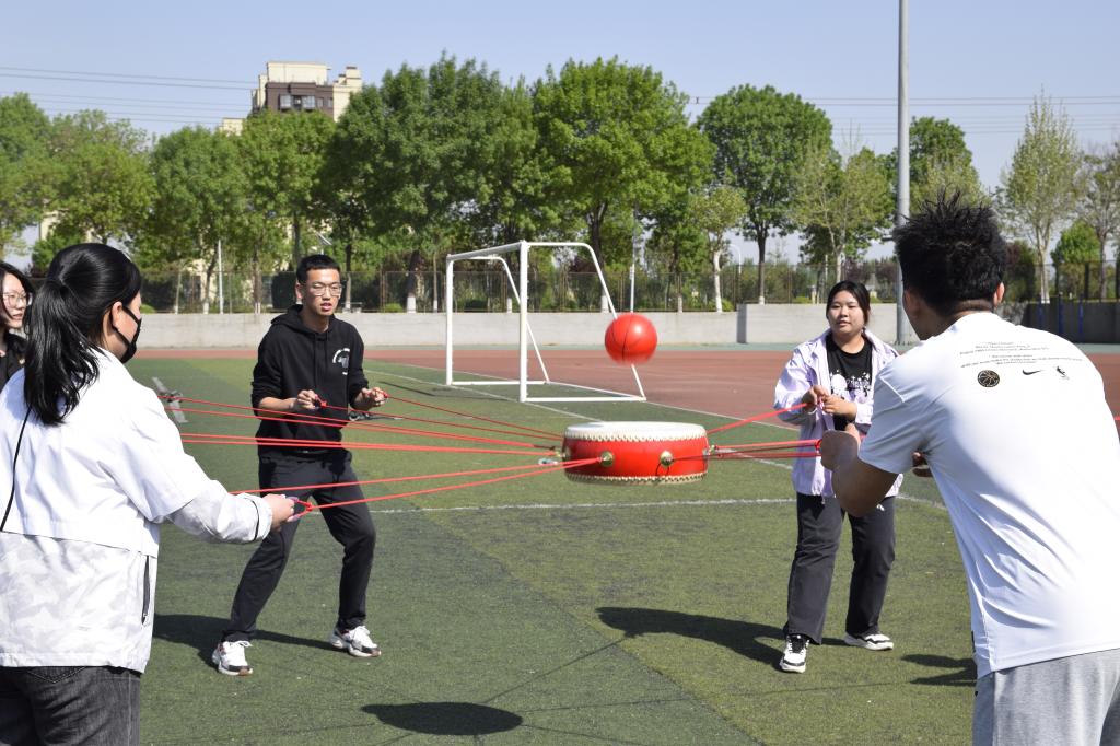 击鼓颠球是一项结合碰撞节奏与团队合作的运动项目,这需要队员们齐心协力完成,因此充分体现了团队中团结合作的精神。经过每个小组的多次尝试,同学们都由原来的生疏变得熟练,开始往固定的方向接球。操场也飘扬着同学们的笑声和有节奏的数球声。